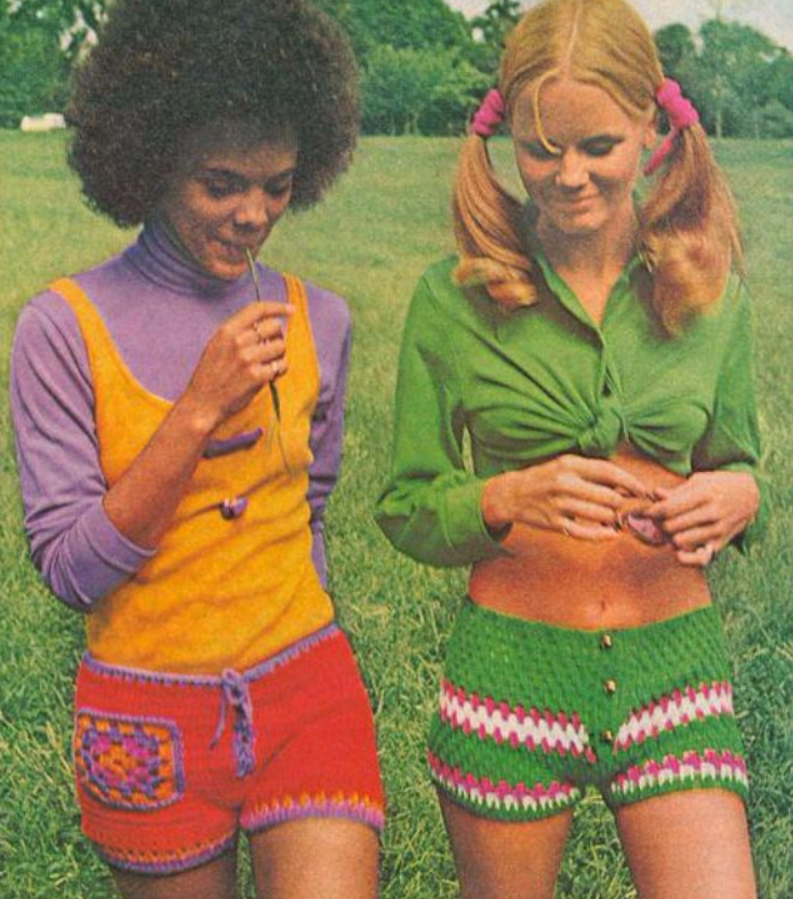 Dans les années 1970, le crochet connaît un renouveau spectaculaire, mais cette fois dans un esprit libre, coloré et contestataire. Exit les napperons, bonjour les crop-tops psychédéliques, les ponchos arc-en-ciel, les robes filets et les sacs à franges. On crochète en coton ou en laine brute, dans un esprit DIY et revendicatif.